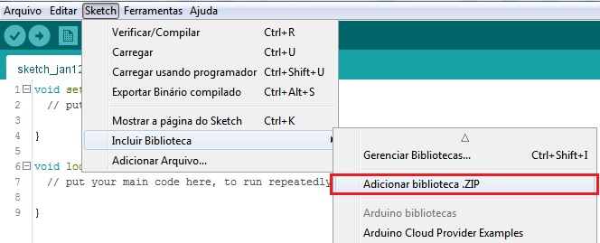 Para incluir a biblioteca .zip na IDE Arduino, vá à opção Sketch → Incluir Biblioteca → Adicionar Biblioteca .ZIP: