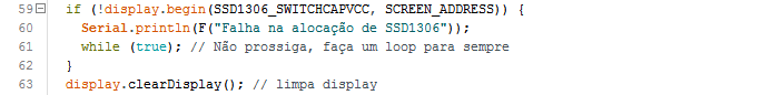 Ainda dentro de void setup, iniciamos o display OLED SSD1306, limpando-o em seguida.