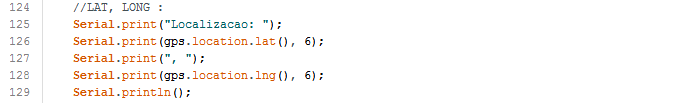 Ainda dentro de void loop, exibimos na Serial os dados de localização atual do módulo GPS. No vídeo de Funcionamento Final, não são exibido os dados de localização por motivos de segurança.