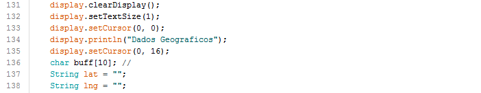 Também exibimos no display OLED os dados de localização. Pelos mesmos motivos acima descritos, não exibiremos os dados de localização no display no vídeo de Funcionamento Final. Também criamos um buffer para ajudar a converter os dados de localização de double para String.