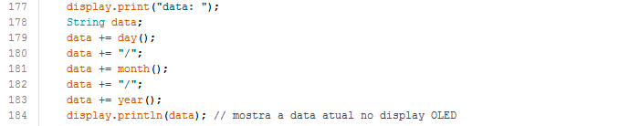 Exibimos, em seguida, no display OLED os dados de data obtidos da biblioteca TimeLib.h.