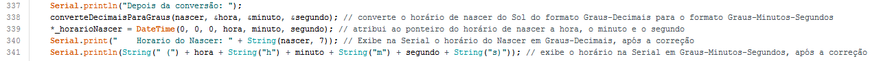 Após o cálculo, exibimos na Serial o horário de nascimento do Sol e o passamos para o ponteiro de horário,