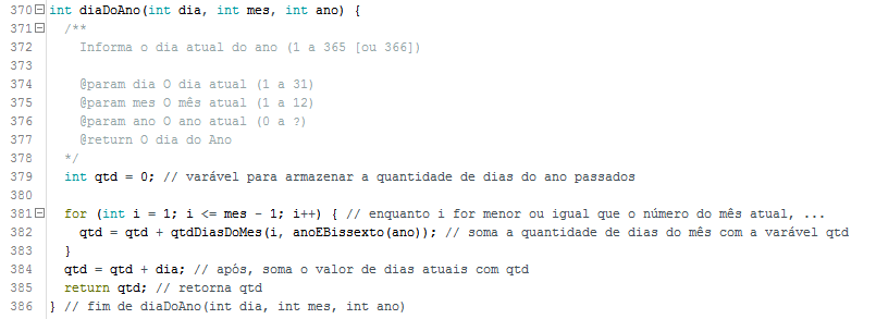 A função diaDoAno(), retorna o dia atual do ano (1 a 365 [ou 366 se bissexto]). Para isso, somamos os dias dos messes completos + os dias do mês atual.