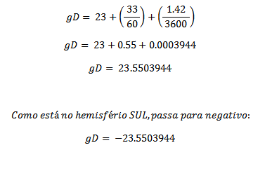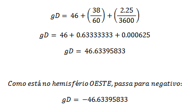 Caso a medida Grau-Minuto-Segundo esteja no hemisfério Sul ou Oeste, o resultado em Graus-Decimal será negativo.