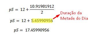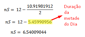 Após o cálculo da duração do dia, é feito a obtenção da duração da metade do dia e o cálculo do horário de nascimento e poente do sol: