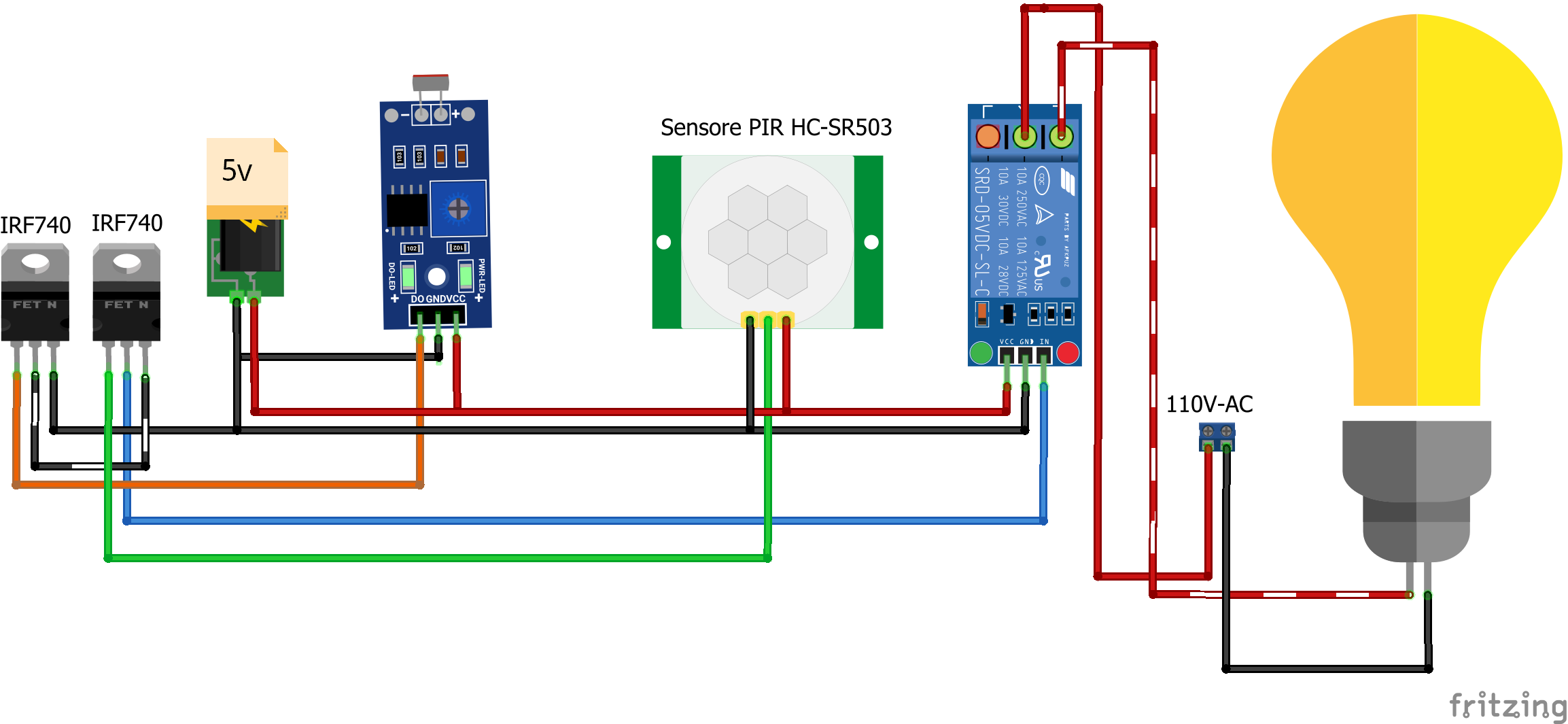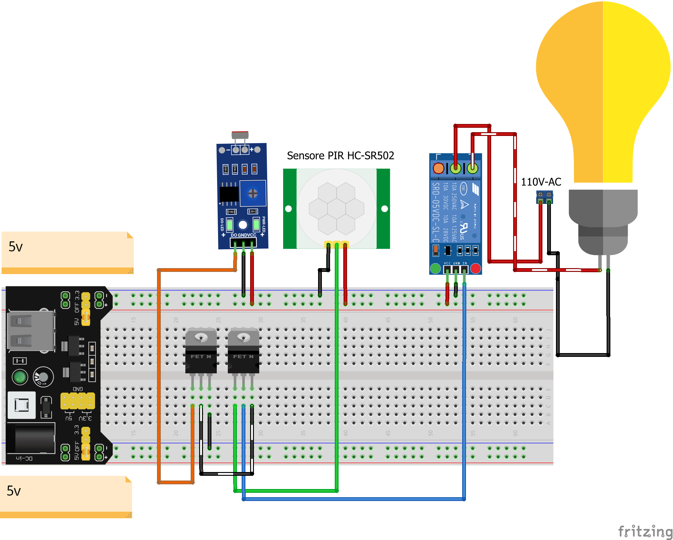 Observação: No vídeo, o sensor PIR foi ajustado para o tempo mínimo de retardo, e devido a isso, a lâmpada acende e apaga rapidamente.