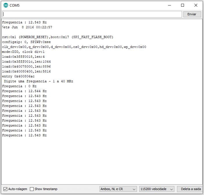 Para facilitar a leitura da frequência no display, pontos são inseridos a cada 3 dígitos, usando as funções ultos e ltos. Essa frequência, além de ser mostrada no display LCD e é enviada também para a console serial da Arduino IDE. Após a amostragem da frequência, os registradores são zerados e as contagens de tempo e dos pulsos são reiniciadas.