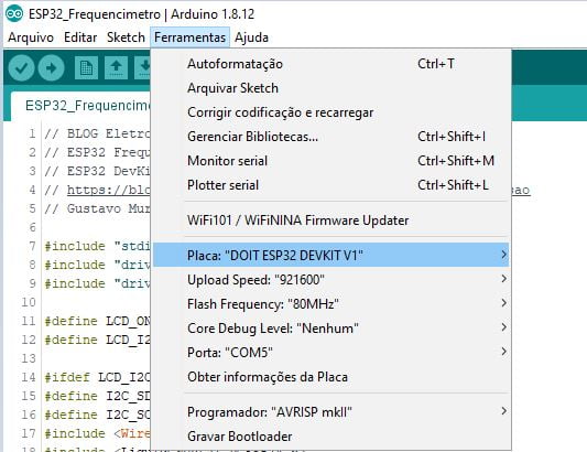 Se você ainda não configurou a Arduino IDE para ser usada com o Placa ESP32, siga o procedimento do tutorial no link abaixo. Essa configuração é essencial para que o projeto funcione adequadamente. Se a sua Placa ESP32 for diferente do Tutorial, altere as configurações na Arduino IDE.