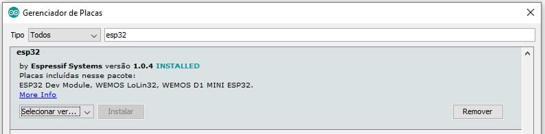 A Versão do firmware do ESP32 para a Arduino IDE usada nesse projeto foi a V 1.0.4. Se estiver desatualizada, atualize-a antes de compilar o seu programa, para evitar algum tipo de problema. Use o Gerenciador de placas para atualizar, se necessário.