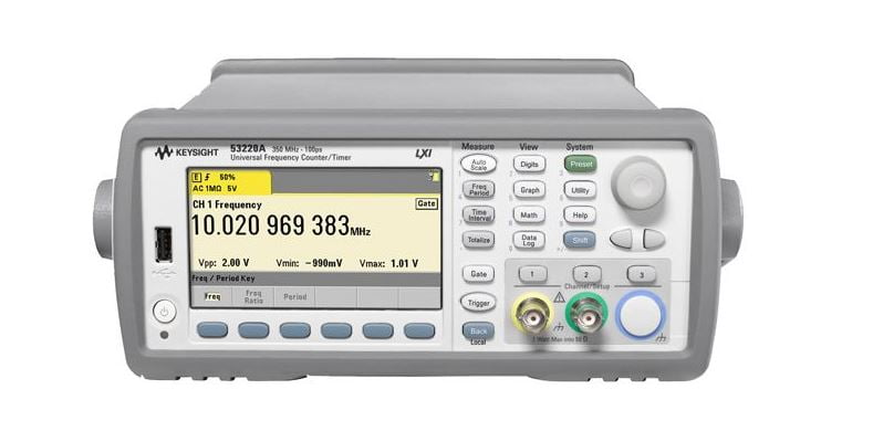 Mas ainda pode ficar a dúvida! Qual é a utilidade de um frequencímetro? Como a faixa de frequência é bem ampla no caso do nosso frequencímetro, esse instrumento pode ter inúmeras aplicações! E com algumas alterações no projeto pode-se medir RPM, pulsação cardíaca e muitas outras variáveis cíclicas. Além de possibilitar o desenvolvimento de aparelhos de medição de capacitância, indutância, etc. Veja abaixo um moderno (e muito caro) frequencímetro do fabricante Keysight:
