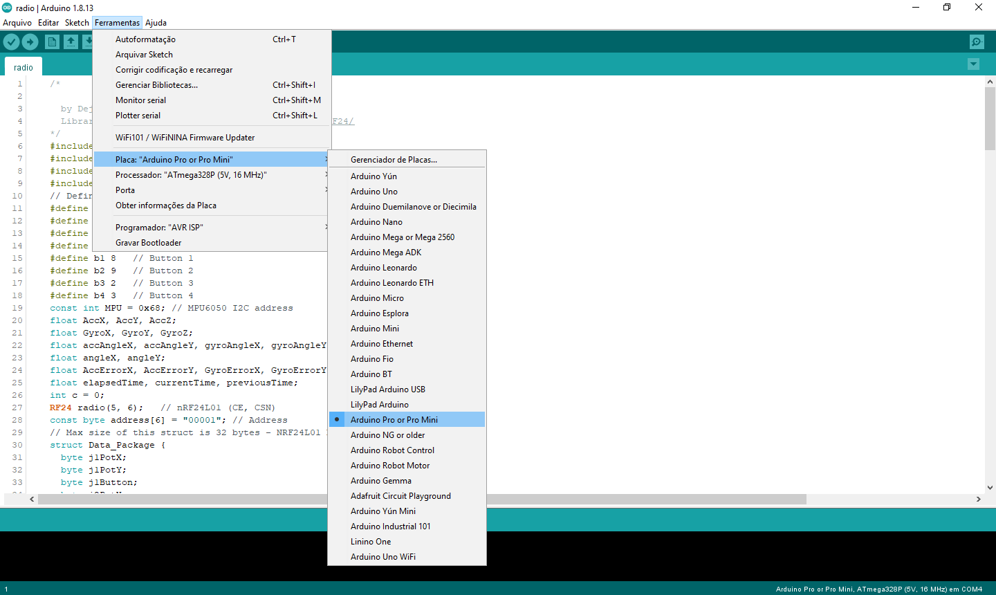 Para carregar o código, selecione a opção “Arduino Pro or Pro Mini”, selecione a porta COM e faça o envio.