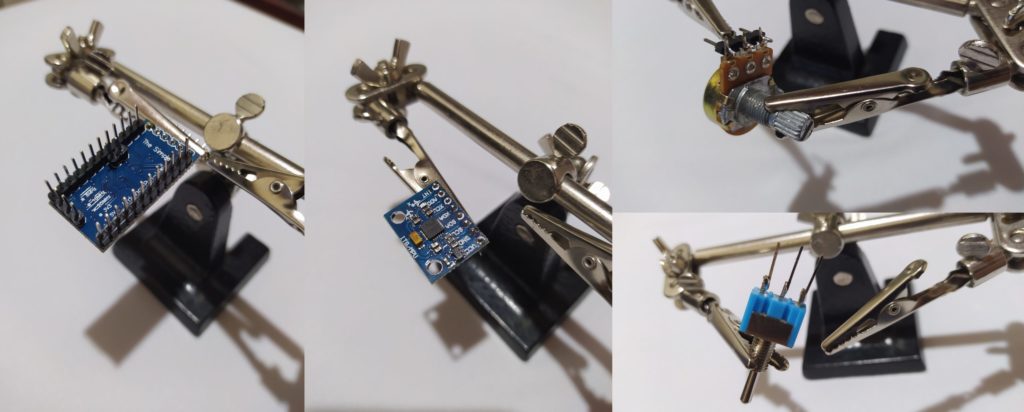 IMPORTANTE: Alguns joysticks não possuem ilhas de solda na parte superior, o que requer um pouco mais de cuidado e atenção na hora de realizar o processo. Será necessário utilizar um suporte para segurar o módulo e a barra de pinos, para que a soldagem seja realizada por baixo, conforme a foto:
