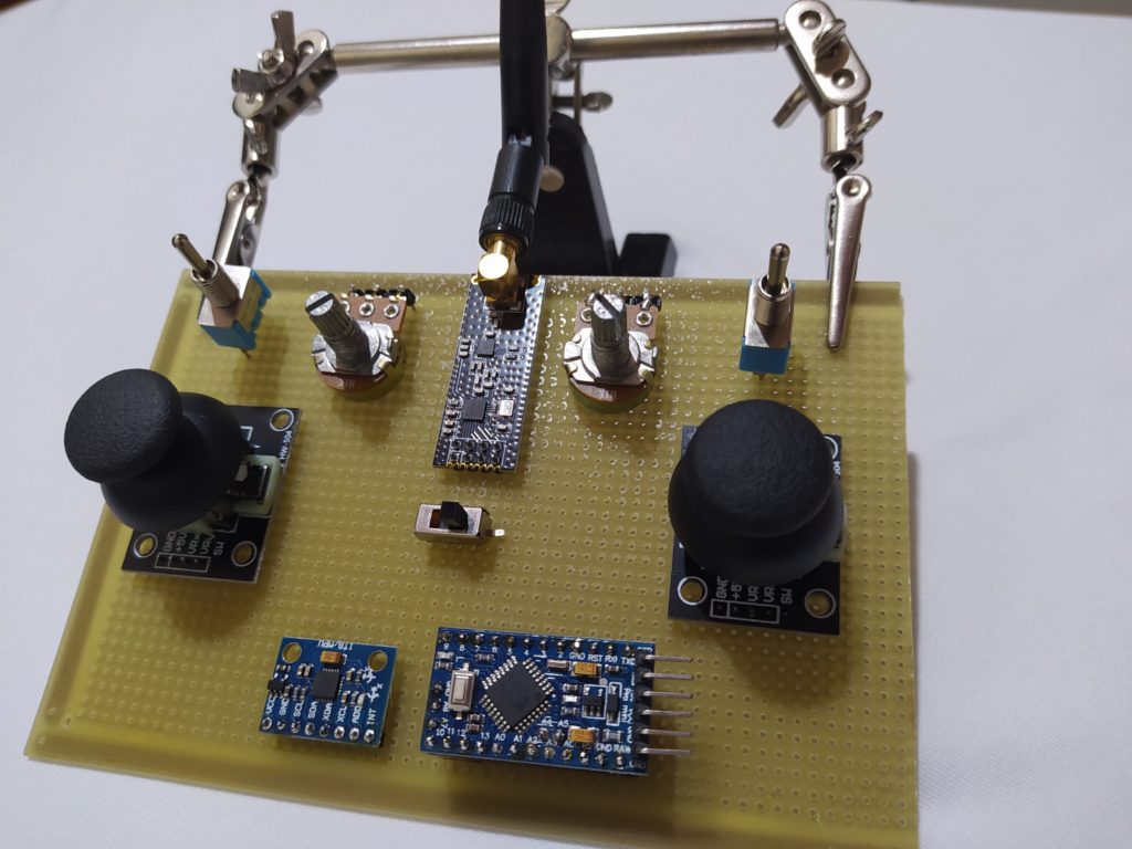 Após essa etapa, vamos posicionar os componentes de forma que fiquem confortáveis nas nossas mãos. Tiramos por base a posição dos sticks e chaves de um rádio controle profissional, já que as chaves auxiliares e potenciômetros estão numa posição de fácil acesso sem que seja necessário soltar os sticks.