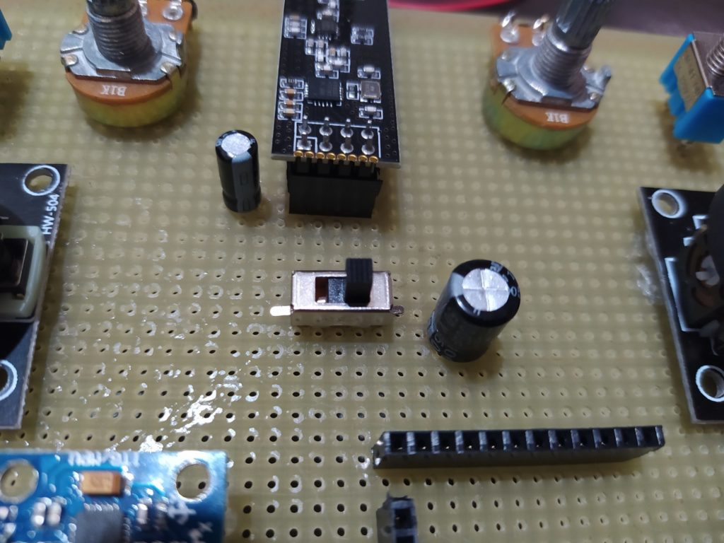 Para a montagem do transmissor, vamos começar preparando os componentes. É necessário soldar pinos em todos eles para facilitar a montagem. Também precisamos trocar os pinos em 90° do módulo Joystick pelos de 180°, para facilitar o encaixe na placa perfurada.
