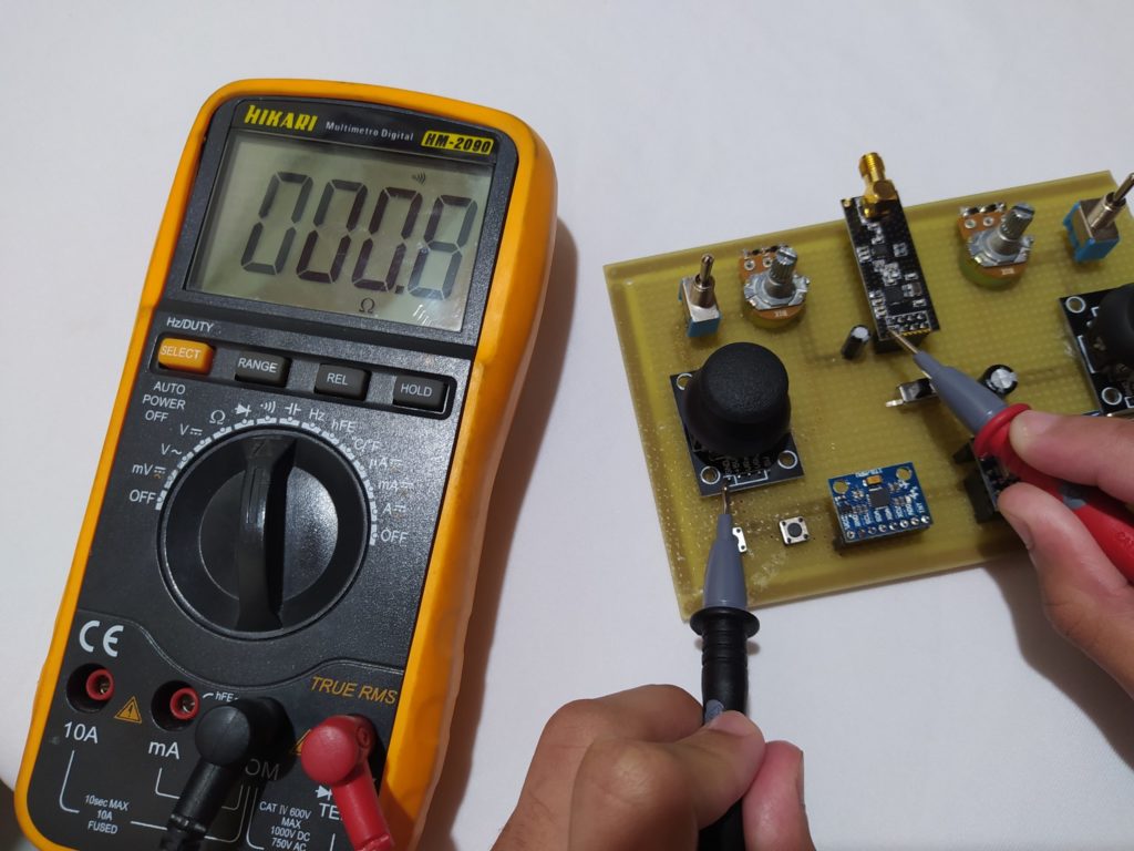 Esse passo é extremamente importante para que você possa verificar erros de conexão que possam ter passado despercebido e evite uma dor de cabeça maior ainda no decorrer da montagem. Para isso, pegue um multímetro e posicione na escala de continuidade. Faça os testes de ponto em ponto, verificando se existe conexão e nenhum terminal está em curto. Para os pontos em comum (GND e VCC), escolha um único ponto e verifique se existe conexão entre ele e os demais de mesma polaridade, assim você garante que tudo está alimentado corretamente.