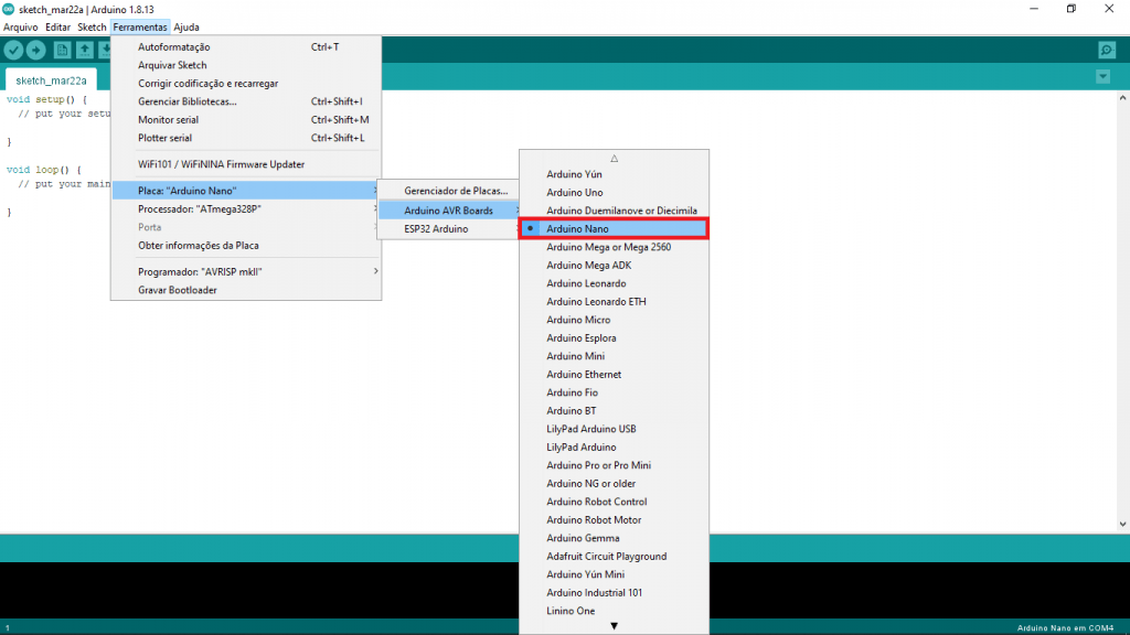 A programação de um Arduino Nano pode ser feita através do ambiente IDE. Clique na opção Ferramentas e selecione a placa nano, como demostrado abaixo.