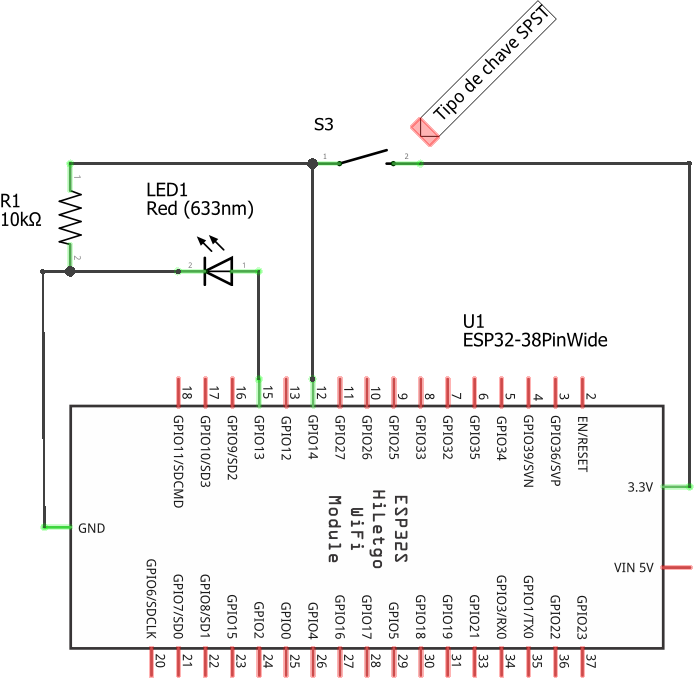 Observe que no nosso esquemáticos estamos usando uma chave do tipo SPST – Single Pole Single Throw (Um Polo, Uma Posição).