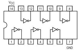 O circuito integrado mais utilizados é o IC 7404, que possui 6 portas NOT em suas conexões e tem a seguinte pinagem: