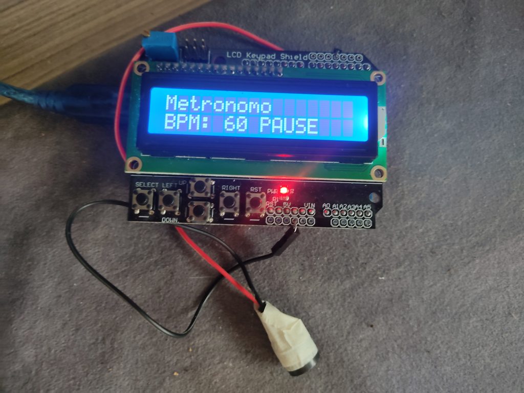 }Assim como na versão analógica, o metrônomo digital fornece feedback sonoro por meio de um buzzer e também oferece uma referência visual do pulso. Nesta implementação, a indicação visual é realizada utilizando o próprio LED integrado ao shield de display e botões, dispensando componentes externos adicionais. Esse LED é sincronizado com cada batida do metrônomo, funcionando como um indicador visual direto do pulso para o músico.