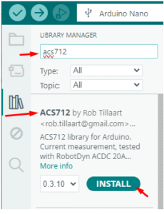 Como na imagem acima busque na IDE do arduino a aba de bibliotecas e pesquise por “acs712”, depois verifique a biblioteca fornecida por Rob Tillaart e precione o botão de instalar.