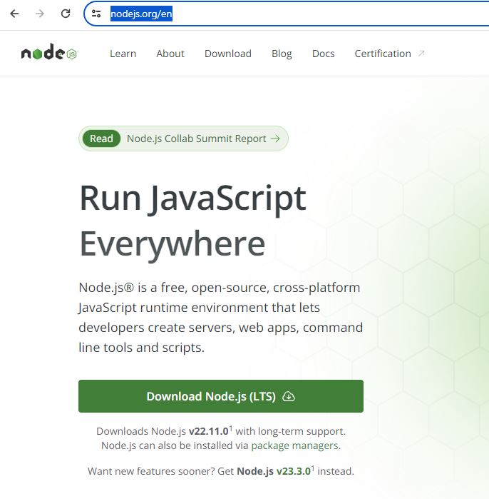 Acesse a página de download do software Nodejs em https://nodejs.org/en e selecione a opção de download: