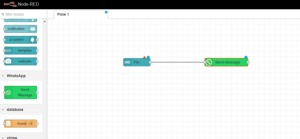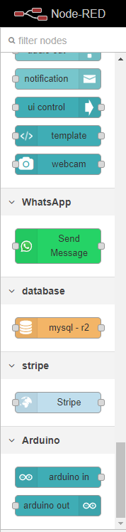 No menu lateral esquerdo insira os “nós” “Whatsapp” e “ArduínoIn” na tela central arrastando-os e os interligando com o botão esquerdo do mouse.