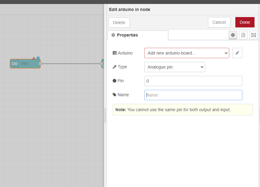 Clique primeiramente sobre o nó “ArduinoIn” e o configure selecionando a porta COM( serial) adequada e na propriedade tipo selecione “Analogue Pin” e marque a opção pin como “0”
