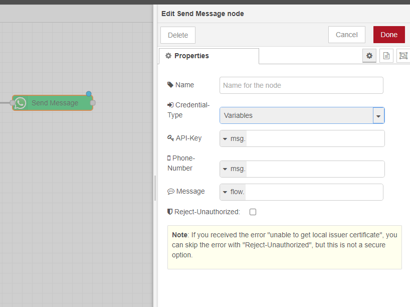 feito isso clique em done e agora clique sobre o nó “Whatsapp”