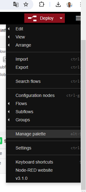 Ainda com Node Red aberto procure pelo menu expansível ao lado do botão “DEPLOY” e selecione a opção “MANAGE PALLETE” para adicionar o Nó de configuração necessário.
