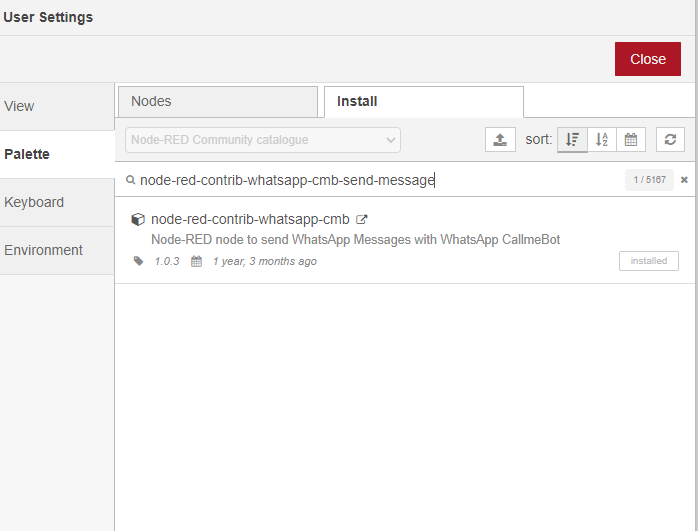 Na guia de instalação procure por “node-red-contrib-whatsapp-cmb-send-message” e após realizar a instalação, realize a instalação da dependência “FIRMATA” disponível já por padrão na nossa IDE do Arduíno que fará comunicação com a plataforma via porta SERIAL transmitindo assim os dados do nosso LDR.