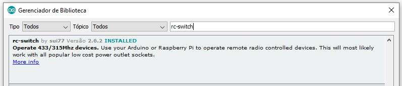 Após abrir a janela do Gerenciador de Biblioteca, refine a busca digitando rc-switch. Na biblioteca RC-switch, clique em More Info e depois em Instalar. Após alguns segundos, ela será automaticamente instalada. Lembre-se que o seu computador precisa estar conectado na internet, para poder baixar a biblioteca. Após a instalação da Biblioteca, é necessário que feche e abra novamente o programa Arduino IDE.