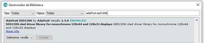 Para o uso do display OLED, duas bibliotecas precisam ser instaladas na Arduino IDE – a Adafruit_SSD1306 e a Adafruit-GFX. Use o mesmo procedimento usado para a instalação da biblioteca RC-switch.