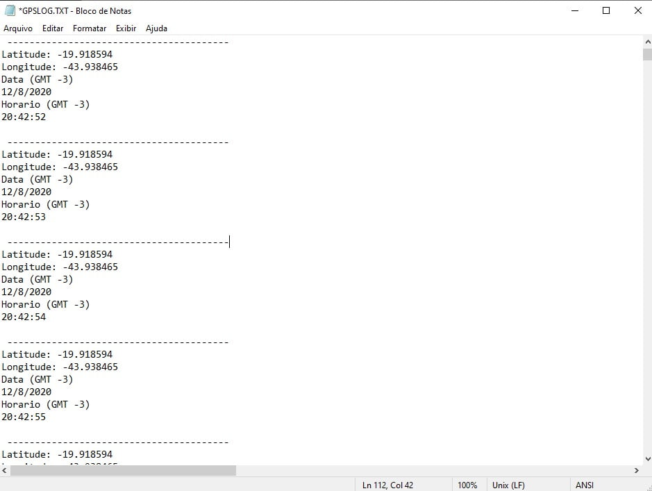 }Retirando o SD da Shield e colocando no computador, vemos que os dados foram registrados corretamente: