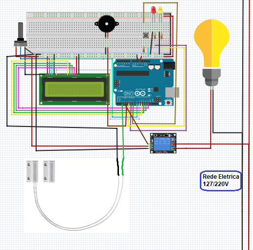 A base do projeto consiste em acionar o sistema de segurança por meio de um botão “secreto”, possibilitando a identificação de algo fora do padrão definido por meio de um sensor magnético. Após o sensor identificar essa anomalia no padrão de funcionamento definido, o sistema enviará um sinal que permite o acionamento de diversas cargas. Nesse projeto utilizaremos um buzzer e uma lâmpada de emergência, mas nada impede o acionamento de uma tranca elétrica ou outros dispositivos eletromecânicos. Para estar realizando o desligamento do sistema em qualquer caso, deve-se pressionar novamente o botão escondido e, além das funções citadas, o projeto também contará com um LCD para nos informar se o alarme foi ativado ou desativado.