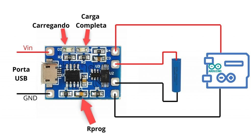 A imagem abaixo mostra como é a ligação do módulo TP4056.