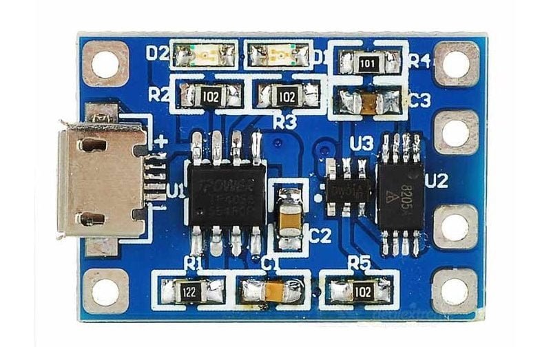 O módulo TP4056 é um carregador para baterias de lítio de 3,7 volts de tensão nominal bem fácil de configurar e utilizar, que também conta com LED mostrador de bateria sendo carregada, carga completa e bateria desconectada.